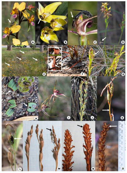 - Brown, J.; York, A. Fire, food and sexual deception in the neighbourhood of some Australian orchids. Austral Ecol. 2017, 42, 468–478. [Google Scholar] [CrossRef]