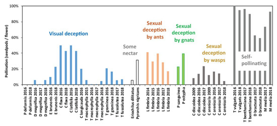 | 1A | Visual deception | bees, etc. | winter | Pheladenia Diuris | P. deformis—0%* D. brumalis—2% [23] |