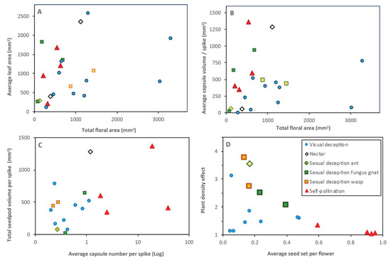 - Ackerman, J.D.; Cuevas, A.A.; Hof, D. Are deception-pollinated species more variable than those offering a reward? Plant Syst. Evol. 2011, 293, 91–99. [Google Scholar] [CrossRef]