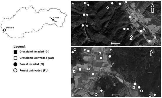 The study was carried out in cadastre of Košice Basin in the lowland of southeast Slovakia (48°42′ N 21°18′ E, Figure 1). Climate in this region is warm and in winter season temperatures range from −1 to −3 °C, in summer season between 18 and 20 °C. Snow covers less 50 days, the number of summer days is 60 to 70 and an annual precipitation is 600 mm. The soil was classified as Halpic Cambisols. The study sites were located within an area of 20 km × 15 km, with mean distance of 3.5 km between each other. Elevation of the study sites ranged from 192 to 380 m a.s.l. The invaded plot was required to have a cover of S. gigantea of at least 80%, while the control sites were adjacent uninvaded plots with no invasive species. The mean distance between the invaded and uninvaded sites was 200 m. The uninvaded sites were assumed to represent sites prior to invasion by this species. Pairs of invaded and uninvaded areas did not differ in elevation, inclination, exposition, type and management. The samples were taken from two different habitats: the forest and grassland ecosystems with no obvious differences in topography, or soil characteristics. Grassland and forest ecosystems were predominantly chosen because the abundance and diversity of the invasive species is easily spreading in these types of ecosystems and extrude native species. No management (mowing and grazing) was performed at the research sites. Control sites (especially grassland) was mainly located close to the arable land and ruderal areas which might directly influence the composition of plant communities. Description of the vegetation was done for the dominated species occurred at the moment of soil sampling.