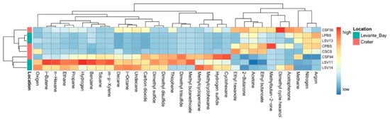 To evaluate whether the differences between the two sampling sites, in terms of composition of the bacterial community, can be possibly correlated to the gas emissions present in these areas, a CA analysis was performed on the samples on the basis of the gas emissions (Figure 4b). In this case, the samples LSV11 and LSV14 appeared to be similar to each other, as did LPBS, CPBS, and LSV13, whereas the other samples were separated. Permutational multivariate analysis of variance resulted in a p-value = 0.97, showing no interstitial gases differences between the sampling sites.