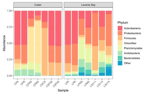 Bar plot showing the relative abundances of bacterial phyla in each sample (from Crater, on the left, and Levante Bay, on the right). Amplicon sequence variants (ASVs) representing <3% of the whole community were reported as “Other”.
