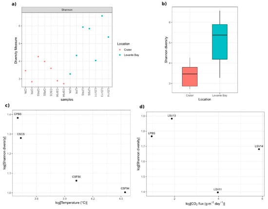 Shannon diversity of samples bacterial communities. (a) Samples’ Shannon diversity indices, calculated on raw data; (b) box-whiskers plot of the indices based on the different sampling area: Ends of the whiskers represent the lowest and the highest point still within 1.5 of the inter quartile range (IQR); (c) relation between Crater samples soil temperatures and Shannon diversity indices (log transformation of the data has been performed); (d) absence of correlation between Levante Bay samples CO2 fluxes and Shannon diversity indices (log transformation of the data has been performed).