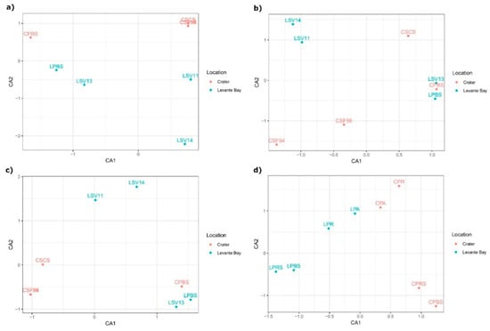 Correspondence analysis (CA) showed a high similarity between the Crater soil samples CSF94, CSF56, and CSCS, while Levante Bay soil bacterial communities of the different samples resulted in being diverse from each other (Figure 4a). Different community structures were tested using permutational multivariate analysis of variance, resulting in a coefficient of determination R2 = 0.24 and in a non-statistically significant p-value (p-value = 0.09).