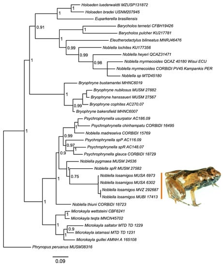 We recovered a phylogenetic tree (Figure 1) that was congruent with previous analyses [16,21], and supported a unique history of divergence of the new species. There was strong support for placing the new species in a clade containing species of Noblella distributed in southern Peru as well as several species of Psychrophrynella. According to this analysis, the new species is most closely related to Noblella pygmaea and to an undescribed species (Noblella sp. R in [23]).