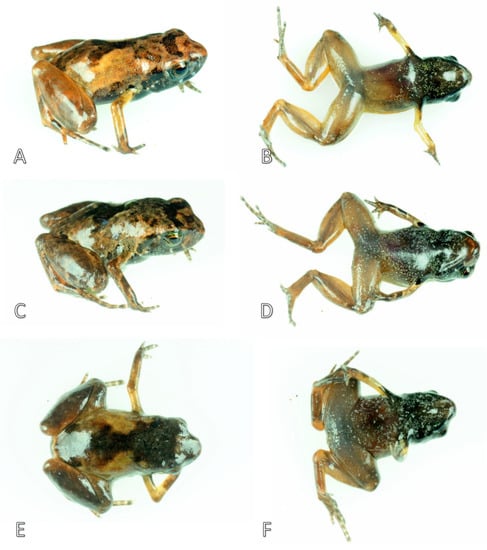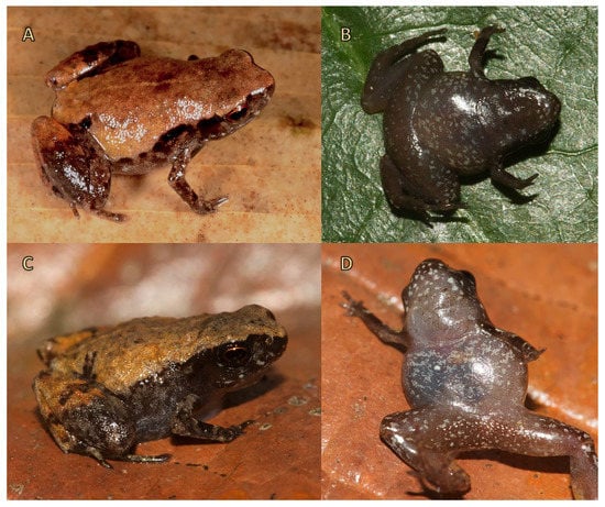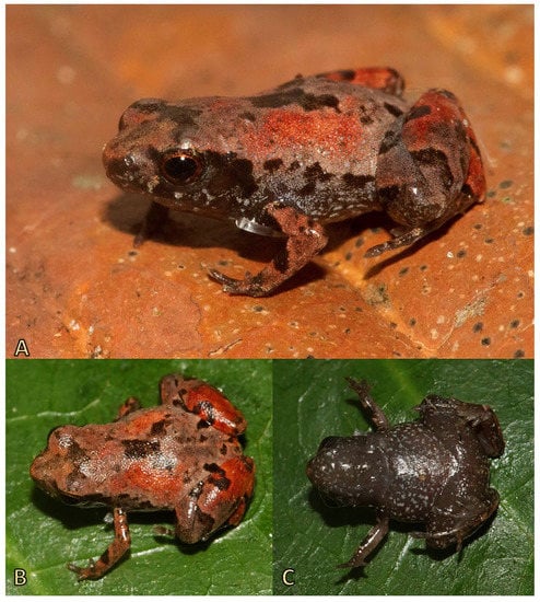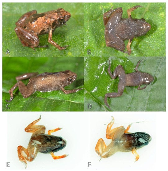 - Kraus, F. At the lower size limit for tetrapods, two new species of the miniaturized frog genus Paedo-phryne (Anura, Microhylidae). ZooKeys 2011, 154, 71–88. [Google Scholar] [CrossRef]