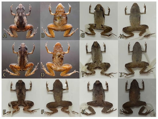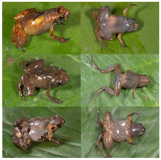 A total of 27 specimens: Three adult males (MUSM 37355, MUSM 37357, UMMZ 246569) and an adult female (MUSM 37356) (Figure 3 and Figure 4); from Los Amigos Biological Station, collected by R. von May and R. Santa Cruz on 26 November 2016; an adult female (UMMZ 246570) from Los Amigos Biological Station, collected by R. von May and R. Santa Cruz on 29 November 2016; three adults (sex unknown) (UMMZ 244945, MUSM 33247, MUSA 6302) from Los Amigos Biological Station, collected by R. von May and R. Santa Cruz on 14–19 May 2014; three specimens male/male/adult (MUSA 6974, MUSM 24219, MUSM 24251) from Los Amigos Biological Station, collected with the holotype by R. von May and R. Santa Cruz on 16 January 2012. Seven males: MUBI 17412, CORBIDI 17521, from San Pedro, Kosñipata Valley (13.04514S, 71.52922W, 1274 m), collected on 7 April 2018 by A. Catenazzi and M. I. Diaz; CORBIDI 17520, from San Pedro, Kosñipata Valley (13.04833S, 71.53178W, 1341 m), collected on 7 April 2018 by A. Catenazzi and M. I. Diaz; CORBIDI 17524 from San Pedro, Kosñipata Valley (13.03724S, 71.52798W, 1200 m), collected on 26 January 2009 by A. Catenazzi; MVZ:Herp:292685, MVZ:Herp:292686 from San Pedro, Kosñipata Valley (13.0541S, 71.54632W, 1370 m), collected on 24 January 2009 by A. Catenazzi; MVZ:Herp:292687, from San Pedro, Kosñipata Valley (13.05093S, 71.53711W, 1375 m), collected on 28 January 2009 by A. Catenazzi. One juvenile: MUBI 17413, from San Pedro, Kosñipata Valley (13.04514S, 71.52922W, 1274 m), collected on 7 April 2018 by A. Catenazzi and M. I. Diaz. Eight females: MUSM 30429, from San Pedro, Kosñipata Valley (13.04335S, 71.53027W, 1234 m), collected on 26 January 2009 by A. Catenazzi; CORBIDI 17523, from San Pedro, Kosñipata Valley (13.05044S, 71.53373W, 1342 m), collected on 26 January 2009 by A. Catenazzi; MUSM 27578, from San Pedro, Kosñipata Valley (13.05686S, 71.54081W, 1369 m), collected on 2 February 2008 by A. Catenazzi; MUSM 30426, MUSM 30427, MUSM 30428, MVZ:Herp:292684, from San Pedro, Kosñipata Valley (13.05193S, 71.5376W, 1376 m), collected on 24 January 2009 by A. Catenazzi; CORBIDI 17522, from San Pedro, Kosñipata Valley (13.05704S, 71.54778W, 1412 m), collected on 7 February 2008 by A. Catenazzi. Dorsal and ventral views of five paratypes (MUSA 6974, MUSM-37355, UMMZ 246569, MUSM 37356, UMMZ 246570), as well as the holotype, are presented in Figure 5. Three-dimensional reconstructions based on μCT data, from the skull and skeleton of two paratypes (MUSM 37355, MUSM 37356) are presented in Figure 6.