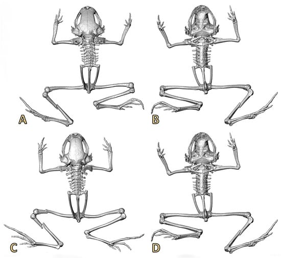 Three-dimensional reconstructions based on μCT data, from the skull and skeleton of two specimens of Noblella losamigos sp. n. (A,B) Dorsal and ventral views of specimen MUSM 37355 (SVL 9.6 mm). (C,D) Dorsal and ventral views of specimen MUSM 37356 (SVL 9.7 mm).
