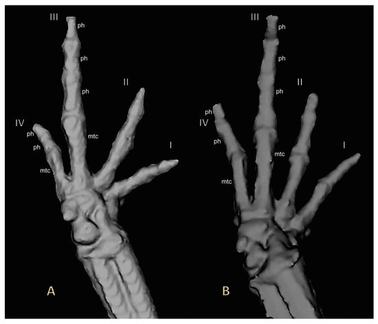 Three-dimensional reconstructions based on μCT data, from (A) adult right hand paratype UMMZ 246570 of Noblella losamigos sp. n. and (B) adult right hand Noblella myrmecoides from Loreto UMMZ 246571. Finger phalanges (ph) and metacarpalia (mtc) are noted for fingers III and IV.