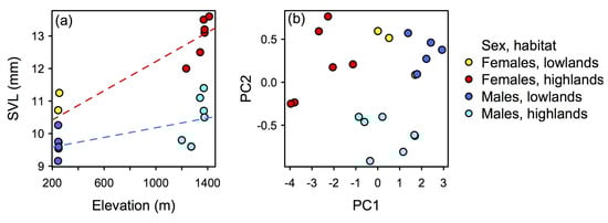 Additionally, we used the morphological data to examine if body size and body shape vary across elevations. We used principal components analysis (PCA) to examine morphological variation between males and females, and between low (<300 m) and high elevation (1200–1490 m) populations. To remove the possible confounding effect of body size, we performed a body size-correction in which all variables were divided by SVL. We used generalized least-squares (GLS) regression to examine the relationship between SVL and elevation, and fitted a regression line separately for males and females. Subsequently, we calculated PCA using the corrected morphological data. We projected the first two PC axes on a morphospace using the function princomp in R and displayed differences between male and females taking into account elevation.