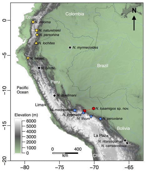 In recent decades, field research conducted in the Andes–Amazon region has uncovered dozens of new species of terrestrial-breeding frogs [12,16,40,45,46,47], and most of these species have small geographic distributions. Prior to this study, the only species of Noblella previously known to occur in lowland rainforest was N. myrmecoides and it was assumed that it had a broad geographic distribution across western Amazonia [48]. Our findings indicate that populations of Noblella from lowland and montane forest in southern Peru previously ascribed to N. myrmecoides represent a new species. Furthermore, our phylogenetic analyses indicate that N. myrmecoides belongs to a different clade than the clade including N. losamigos sp. n., other species of Noblella from southern Peru, and species of Psychrophrynella.