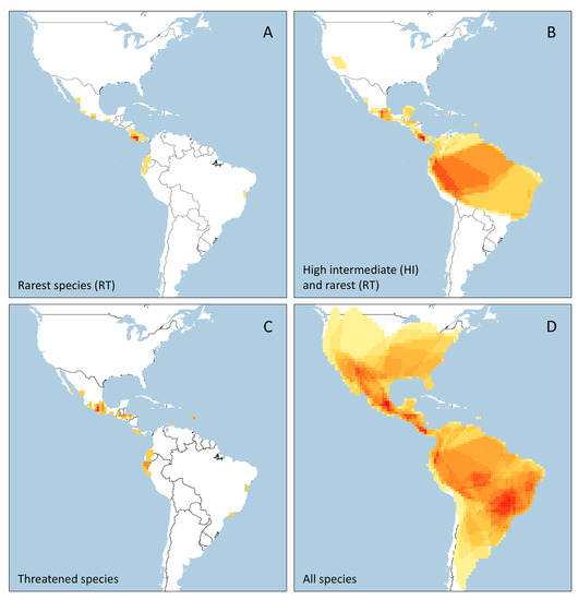 Maps depicting the species richness of New World pitvipers, according to different rarity and threat status categories. (A) Distribution of the rarest species (category RT); (B) distribution of rare species considering both higher rarity categories (HI and RT); (C) distribution of threatened species (IUCN (International Union for Conservation of Nature) categories critically endangered, endangered, and vulnerable); (D) species richness of all New World pitvipers.