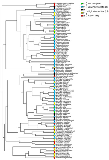 Phylogeny of the New World pitvipers, with colors representing different rarity categories.