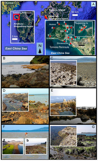 Algal sampling sites in the Tomioka Peninsula, Amakusa-Shimoshima Island, in 2012–2017. (A) Sampling location and sampling points (red circles); (B) Akaiwa, sampling point 5; (C) Magarizaki, sampling point 7; (D) Shikizaki Bay, sampling point 3; (E) Shiraiwazaki Bay, sampling point 2; (F) Tomioka Harbor, (a) sampling point 9, (b) sampling point 11; (G) Tsujishima Islet, sampling point 14.