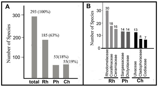 Species diversity and taxonomic composition of new findings of seaweeds along coast of the Tomioka Peninsula in 2012–2017. (A) Absolute and relative species numbers of different taxonomic groups (Rh, Ph, Ch). (B) Species numbers in dominant families.