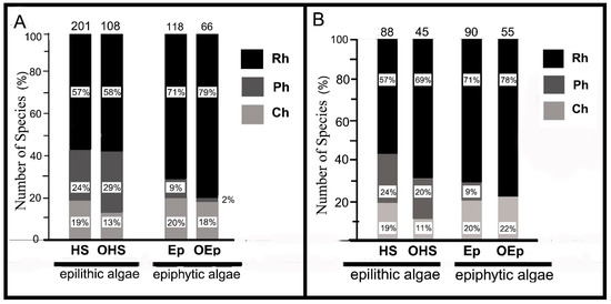 Relative species number from the Phyla Rh, Ch, and Class Ph in different groups of epilithic and epiphytic benthic algae of the collection of 2012–2017: HS, algae growing on hard natural substrates; OHS, algae growing only on hard natural substrates; Ep, algae growing epiphytically; OEp, algae growing only epiphytically. Numbers above the columns are total number of species in individual groups. (A) Collection of benthic macroalgae sampled in 2012–2017. (B) New findings in the collection of 2012–2017.