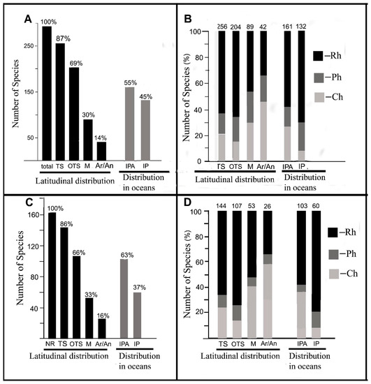 Absolute and relative number of algal species in the collection 2012–2017 in groups differing in geographic (latitudinal) distribution. (A) Species number in different algal groups of the collection 2012–2017. (B) Relative number of species from the Phyla Rh, Ch, and the Class Ph in different geographic groups of algae of the collection 2012–2017. (C) Algal species number in geographic groups of new findings, new records (NR) in the collection 2012–2017. (D) Relative algal species number in the Phyla Rh, Ch, and the Class Ph in different geographic algal groups of new findings in 2012–2017. TS, algae inhabiting tropical and subtropical seas (OTS); M, algae inhabiting the tropics and/or subtropics to temperate zones; Ar/An, cosmopolitan algae growing from the tropics to the Arctic and/or Antarctic; IPA, algae inhabiting the Atlantic, Indian and Pacific Oceans; IP, algae inhabiting the Indo-Pacific.