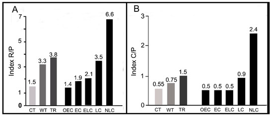 The indices R/P (number of Rhodophyta species divided by the number of Phaeophycean species) and C/P (number of Chlorophyta species divided by the number of Phaeophycean species) in a given flora are very important characteristics of the marine flora in the biogeographic regions [20,21].