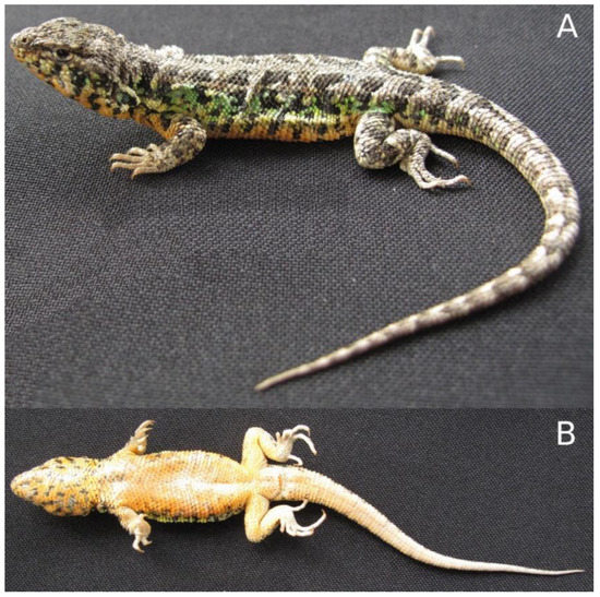 Holotype (male, SVL = 83.3 mm, MUSM 31461) of Liolaemus victormoralesii in dorsal (A) and ventral (B) views.