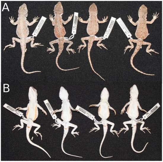 Dorsal (A) and ventral (B) variation in males of Liolaemus chiribaya. From left to right: MUSM 31547 (Holotype, SVL = 52.6 mm), BYU 51568 (SVL unknown), BYU 51570 (SVL unknown), MUSM 31553 (SVL = 52.7 mm).