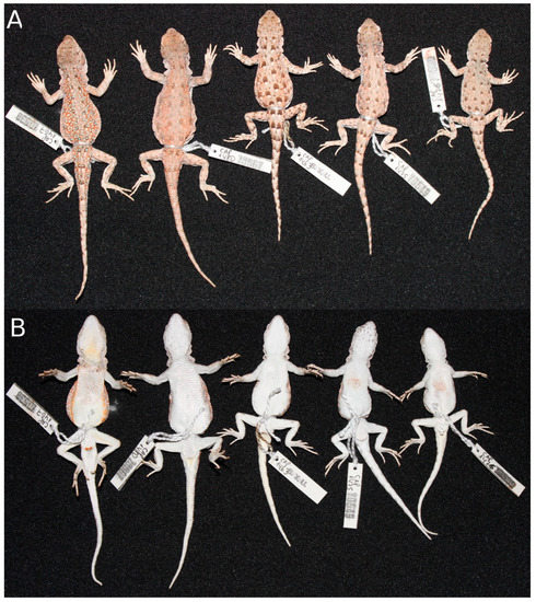 Dorsal (A) and ventral (B) variation in Liolaemus chiribaya. From left to right: MUSM 31546 (male, SVL = 52.5 mm), BYU 51564 (female, SVL unknown), MUSM 31548 (juvenile, SVL = 49.6 mm), BYU 51566 (juvenile, SVL unknown), BYU 51567 (juvenile, SVL unknown).