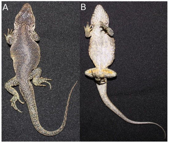 Holotype (male, SVL = 64.5 mm, MUSM 31523) of Liolaemus nazca in dorsal (A) and ventral (B) views.