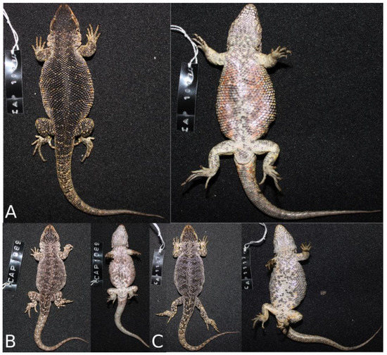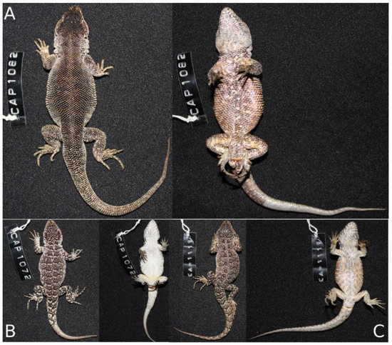 Dorsal and ventral (B) variation in Liolaemus victormoralesii. (A): BYU 50431 (male, SVL = 87.8 mm), (B): MUSM 31462 (juvenile, SVL = 60.9 mm), (C): BYU 50427 (juvenile, SVL = 52.2 mm.