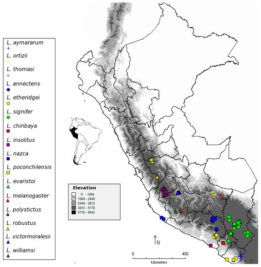Liolaemus species of the L. montanus group comprise about 60 species and several candidate species [1,2,3]. The geographic distribution of this group ranges from central Perú and Bolivia to northern Argentina and Chile, and from sea level to more than five thousand m.a.s.l. Thirteen species in the northern range of this group are known in Perú: L. annectens, L. aymararum, L. etheridgei, L. evaristoi, L. insolitus, L. melanogaster, L. ortizi, L. poconchilensis, L. polystictus, L. robustus, L. signifer, L. thomasi, and L. williamsi ([2,4] this paper). Recently, two candidate species (“Nazca” and “Abra Toccto”) have been proposed based on an integrative approach in the northern range of the L. montanus group, but species description are still lacking [2].
