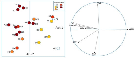 Results of Hill and Smith Analysis on the Publicization of Invasive Status (PIS) indicator. (Left): distributions of the countries studied on the first two axis. (Right): projection of the explanatory variables on the first two axis. Country abbreviations are given in Table 3, variables abbreviations are given in Methods, Section 2.2.