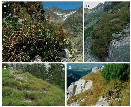 - Petrík, A.; Dúbravcová, Z.; Jarolímek, I.; Kliment, J.; Šibík, J.; Valachovič, M. Syntaxonomy and ecology of plant communities of the Carici rupestris-Kobresietea bellardii in the Western Carpathians. Biologia 2006, 61, 393–412. [Google Scholar] [CrossRef]