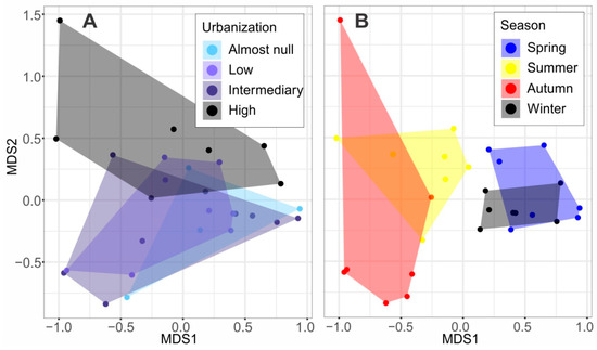 We assessed the relationship of species composition with (1) sampling season and (2) level of urbanization of sampling sites, using the ‘IndVal’ indicator species approach (package ‘indicspecies’, [39]). This analysis estimated the strength of the association between each species and the groups of sampling units defined a priori, and the statistical significance of each pairwise association [39,40]. For the statistical significance tests, we used crisp membership values for both grouping criteria, and the site-based approach for null hypothesis, which considered that the abundance of the species at sites from the same group was not higher than the abundance at sites that belonged to other groups. We reported only significant indicator species (p < 0.05, considering Sidak’s correction for multiple testing). When a species was significantly associated to more than one season or urbanization level, we reported only the association with the highest strength value. All data analyses were carried out in the R environment.