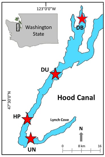 Four sampling stations along Hood Canal: Dabob Bay (DB), Duckabush (DU), Hoodsport (HP), and Union (UN).
