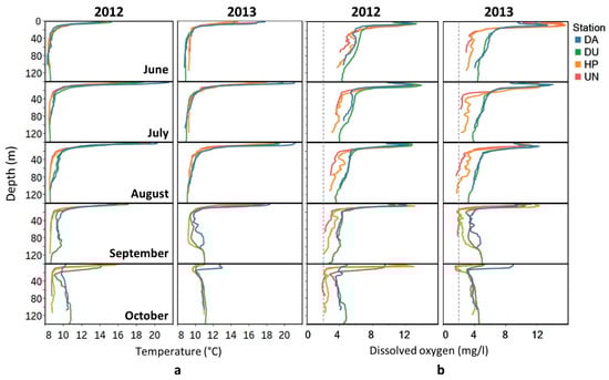 Profiles of (a) temperature and (b) dissolved oxygen concentration from CTD casts conducted in June (top) through October (bottom), 2012 and 2013 at the four sampling sites in Hood Canal. Dashed gray lines indicate 2 mg/L dissolved oxygen.
