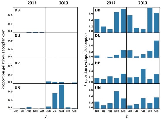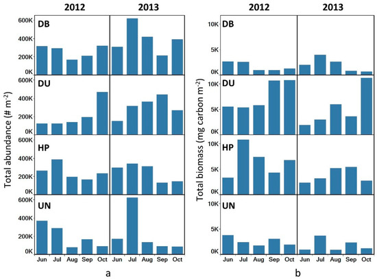 Overall, total zooplankton abundance (number of individuals m−2) was lowest at UN, particularly late in the season in both years, with a notable exception of July 2013 (Figure 4). Abundance was highest overall at DB. Abundances were lower in most months at DU than at HP in 2012, but higher in 2013. The seasonal cycle of abundance differed among stations: abundances dropped from early summer to autumn at UN and to a lesser extent HP, whereas they increased through summer to fall at DU and were variable at DB.