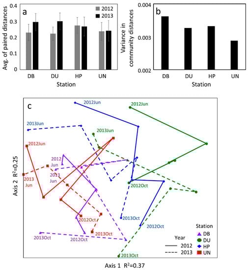 A non-metric multidimensional scaling (NMDS) ordination run on the distance matrix was used to visualize whether a more regular seasonal cycle and lower difference between years occurred at non-hypoxic sites compared to hypoxic sites. Prior to ordination, rare species (defined as those occurring in <10% of samples) were removed and data were Log10(Y + 0.001) + 3 transformed to normalize variances prior to analysis. The use of (Y + 0.001) + 3 rather than (Y + 1) helped prevent distorting the relationship between zeros and small non-zero values in the dataset []. A two-way factorial (Station and Year) permutational multivariate analysis of variance (PerMANOVA) was then run on the distance matrix to test for significant differences among sites and years by testing whether the centroids of the clusters of samples differed. Two pairwise comparisons were conducted following PerMANOVA to further test whether the centroid of communities significantly differed between station pairs: DB and UN, DU and HP. Distance measures were calculated, and NMDS ordination was conducted, in PC-ORD 7.06 [,].