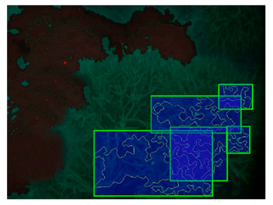 Coral classification using a semi-autonomous machine learning (ML) approach was used with a robotic underwater vehicle (AUV), conducted on Australia’s Great Barrier Reef in order to gather statistics about coral density and composition to the genus resolution. Some 10,000 full resolution images yielded 3000 segments which were hand labeled into the four classes and classified using SVM method. Distinction among these was based upon features of the coral [40]. As shown in Figure 5, the green sector with the branching pattern is the area with corals. The blue rectangles enclose identified areas with classified coral genera or rock. The black area is sand.