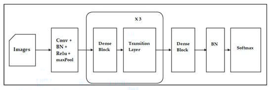 ResNet is a short name for Residual Network. A residual network includes a number of residual blocks. Each block has a shortcut connection to the outputs of the next blocks (see Figure 7). Residual can be simply understood as subtraction of feature learned from input of that layer. ResNet does these using shortcut connections. Training this form of networks is easier than training simple deep CNN and the problem of degrading accuracy is resolved. Improved results for residual ResNet modifications are shown in Table 1. DenseNet differs from ResNet as it adds shortcuts among layers. Each subsequent layer receives all the outputs of previous layers and concatenates them in the depth dimension. In ResNet, a layer only receives outputs from the previous second or third layer, and the outputs are added together on the same depth. DenseNet adds a feature layer (convolutional layer) capturing low-level features from images, from several dense blocks and transition layers between adjacent dense blocks (see Figure 8).