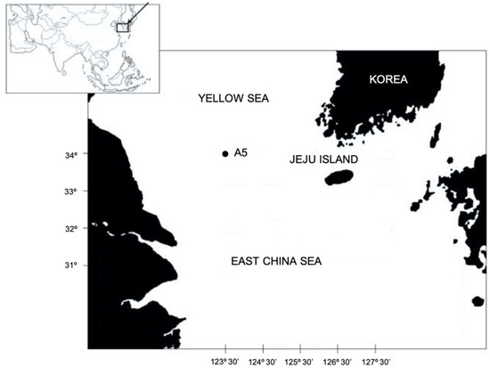 Samples were collected at one site, A5 (34°00′ N, 123°30′ E), among 18 field sites off the coast of Jeju Island, South Korea from 24 September to 3 October 2002 (Figure 1) by the R/V Ara (Jeju National University) [5]. Sediments were collected with a box corer, and five replicates were taken from each box corer. Three replicates were used for analyses of meiofauna. Organisms were extracted from sediments by a Ludox-Am. Copepods were sorted under a dissecting microscope and stored in 70% ethanol. Dissections were applied to the specimens in lactic acid and the dissected appendages were mounted permanently on slides in lactophenol mounting medium. Preparations were sealed with transparent nail varnish. Each appendage was observed and drawn under an Olympus BX51 differential interference contrast microscope using a drawing tube. The descriptive terminology is adopted from Huys et al. [6]. Abbreviations are A1, antennule; A2, antenna; ae, aesthetasc; exp, exopod; enp, endopod; P1–P6, first to sixth thoracopod; exp(enp)-1(2, 3) to denote the proximal (middle, distal) segment of a ramus [6]. Specimens were deposited in the National Institute of Biological Resources (NIBR), Korea, and in the Marine Biodiversity Institute of Korea (MABIK). All scale bars in the figures are in µm.