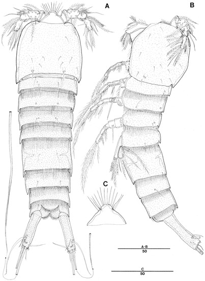 Female. Total body length: 239 µm (measured from anterior margin of rostrum to posterior margin of caudal rami). Largest width measured at posterior margin of cephalic shield: 63 µm. Urosome gradually tapering posteriorly (Figure 2A).