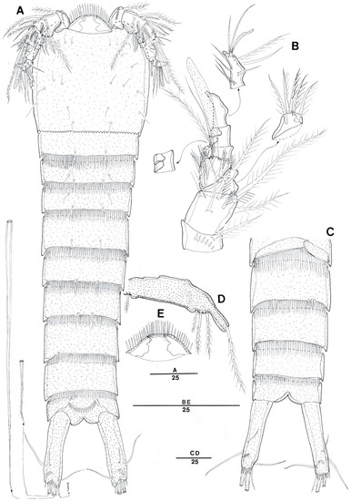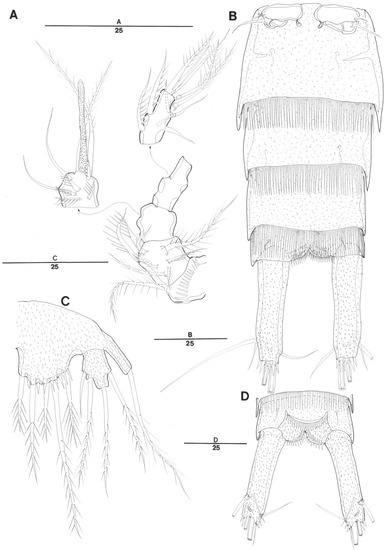 Urosome (Figure 7A) six-segmented, comprising P5-bearing somite, genital somite and four abdominal somites. All urosomites covered with small denticles dorsally and ventrally and with well-developed hyaline frill along the hind margin.