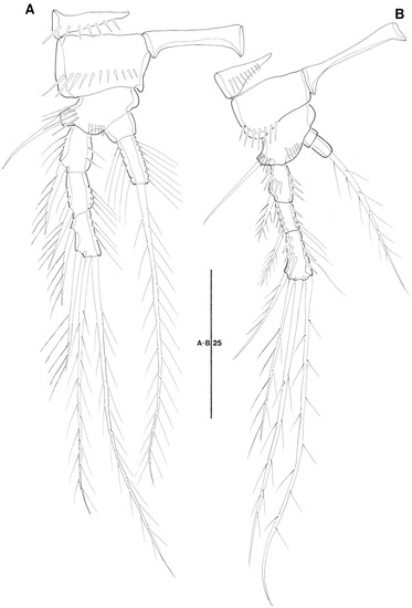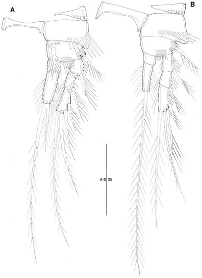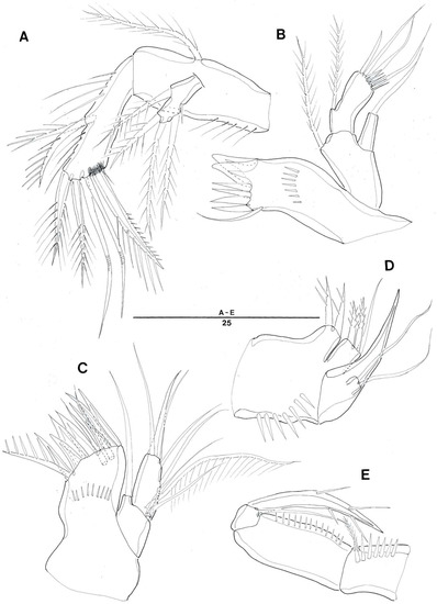 P2–P4 (Figure 5B and Figure 6A,B). Coxae and bases ornamented with spinular rows along outer or distal margins and anterior surface. Outer margin of basis producing a setophore armed with pinnate spine (P2) or naked seta (P3–P4) at each distal end. All segments with rows of spinules along inner and outer margins as figured. Endopod segments of P2–P3 with long setules or spinules alonge inner and outer margins. P4 endopod without setula ornamentations. P2 enp-2 three times longer than enp-1, endopod reaching to proximal area of exp-3, and exp-3 longest. P3 enp-2 2.5 times longer than enp-1, endopod reaching to middle of exp-2, and exp-1 largest. P4 endopod small, enp-2 2.3 times longer than enp-1, endopod reaching to middle of exp-1, and exp-3 longer than exp-1.