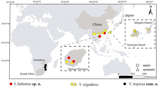 Distribution. Yaeprimus was known only from two small Japanese islands for Y. isigaabeus. Our study has expanded the genus distribution to south China, South Africa, and Zimbabwe. All specimens have been collected from subtropical and tropical regions.