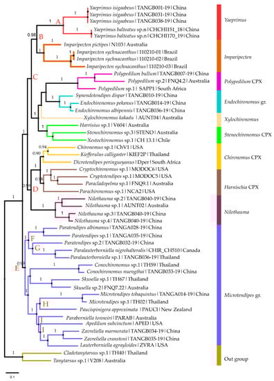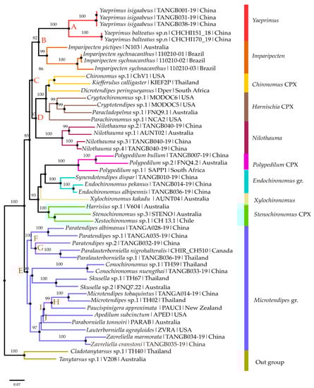 - Lin, X.L.; Stur, E.; Ekrem, T. Molecular phylogeny and temporal diversification of Tanytarsus van der Wulp (Diptera: Chironomidae) support generic synonymies, a new classification and centre of origin. Syst. Entomol. 2018, 43, 659–677. [Google Scholar] [CrossRef]
