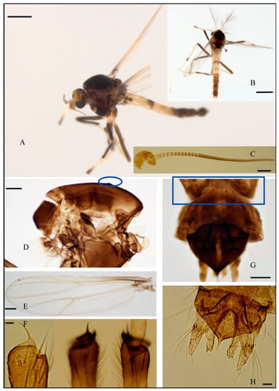 Head. Antenna (Figure 4C) with pale brown (approximal and distal) or brown (middle) flagellomeres, with almost dark plume. Flagellomere 1–12, 340–390, 358; flagellomere 13, 540–640, 570; AR 1.57–1.64, 1.60 (4). Palpomere lengths (in μm): 25–30, 28 (3); 25–35, 30 (3); 115–125, 120, (3); 100–124, 111 (3); 180–200, 190. Temporals were 10–12, 11. Clypeus had 14–17, 15 (5) setae. The diameter of cephalic tubercle 5 μm, bearing 3–5 small setae.