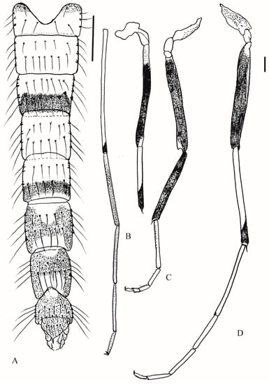 - Yamamoto, M.; Yamamoto, N. A review of Yaeprimus isigaabeus Sasa et Suzuki, 2000 (Diptera: Chironomidae), with taxonomic notes on the genera distributed in Yaeyama Island. In Proceedings of the 17th Intertional Symposium on Chironomidae, Nankai University, Tianjin, China, 6–10 July 2009; Wang, X.H., Liu, W., Eds.; Nankai University Press: Tianjin, China, 2009; pp. 224–239. [Google Scholar]