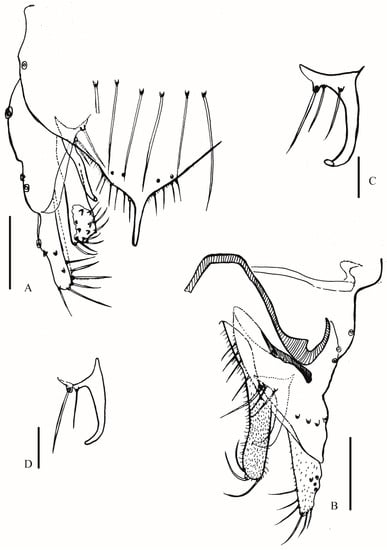 Hypopygium (Figure 4H and Figure 6A,B). T IX with a row of 4–6 setae, arising from fairly large microtrichia-free pit, without distinct lateral group. Distal margin with 3–5 setae both in the dorsal and ventral surfaces. Gonocoxite 115–132, 126 (4) μm long. Gonostylus relatively short, 35–48, 43 (4) μm long, distal portion with 6–10 inner–toward setae, the longest one about 25 long. Superior volsella (Figure 6C,D) with a base without microtrichia, bearing 2–3 inner setae from the tubercle base, distal digitus long and slender, distal curved inwardly, without inner seta. Inferior volsella slightly bullous distally, with 13–16 setae. HR 2.79–3.29, 2.97 (4); HV 5.58–7.14, 6.37 (4).