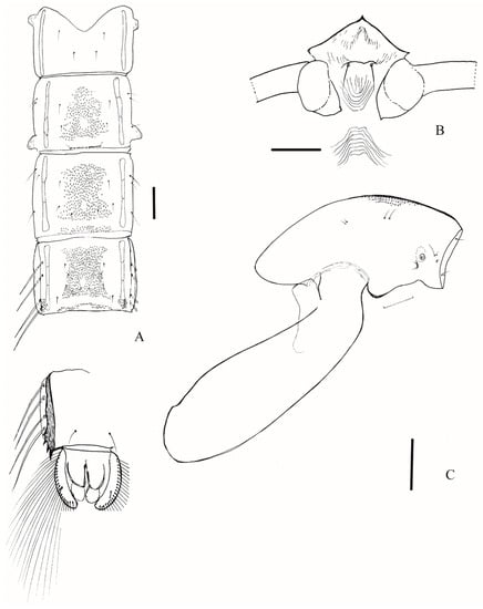 Y. balteatussp. n., pupa. Illustration: (A) abdomen, dorsal view; (B) cephalothorax; (C) thorax, lateral view. Scale bar: A–C, 100 μm.