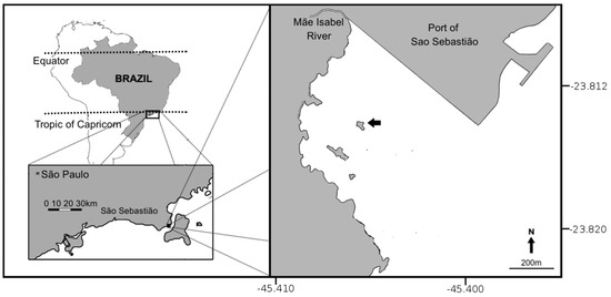 This study was conducted in the Southeastern Brazil, in the Araçá Bay (São Sebastião, SP; Figure 1). Despite the relatively small size of the bay (~500 m2), this is a heterogeneous bay composed by rocky shores, sandy beaches, small mangrove spots and a larger soft bottom, being a hot spot of marine biodiversity [23]. The variety of different habitats in short distances makes this as a special region to test our hypothesis regarding habitat heterogeneity from smaller to larger scales. In addition to the ecological questions, our study will help to support a discussion regarding anthropogenic impacts at the bay. Araçá Bay is under the threat of the eminent expansion of the port of São Sebastião, which will cover 75% of the bay with a structure suspended by pillars, potentially reducing the occurrence of macroalgae [24], which host diverse associated fauna [25].