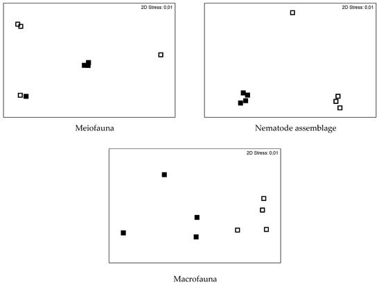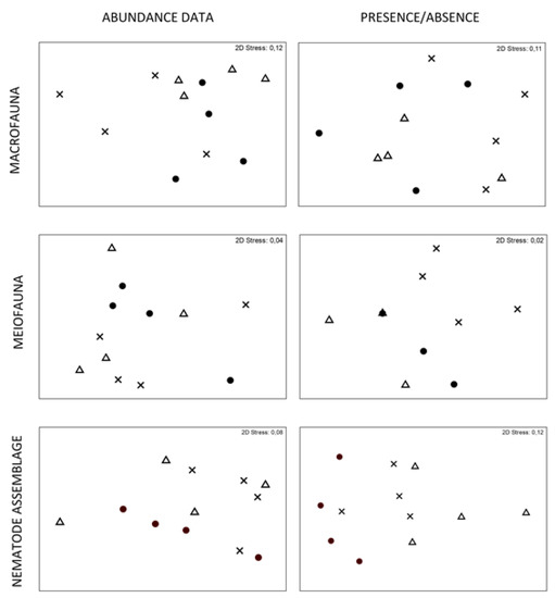 Non-metric multidimentional scaling (NMDS) ordination representing the similarity between samples from the substrates “Turf” (Δ), “Caulerpa” (●) and “Sponge” (x) for macrofauna, meiofauna and nematode assemblages.