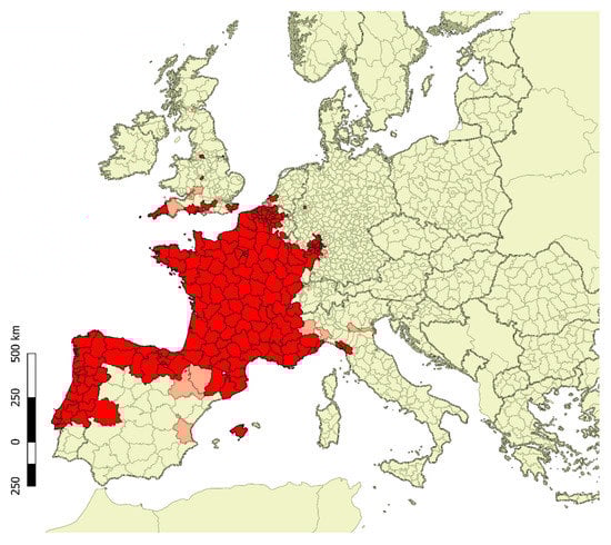 The species established itself in non-native countries such as South Korea in 2003 [] in the southern port town of Busan and Japan, on Tsushima Island in 2012 [,], in Kitakyushu City on Kyushu Island in 2015 [] and on Iki Island in 2017 []. Arrived in France probably in 2004 along with garden pots imported from China [,], the species spread to neighboring countries. From France it reached the Navarra province and Basque country (Spain) in 2010 [,], Galicia [] and Catalunya [] in 2012, Majorca Island (Spain) in 2015 [,], the Minho province (Portugal) in 2011 [], and Flobecq in the Hainaut province (Belgium) in 2011 []. In 2012, the Asian yellow-legged hornet was detected for the first time in Italy in the Liguria Region []; afterwards the hornet started to spread in this region mainly along the coastline [,,]. In Piedmont Region (Italy) arrived in 2013 [,]. It was detected also in Veneto and Lombardy Regions (Italy) between 2016 and 2017, with no more reports in the following years, and in Tuscany Region (Italy) in 2017. By 2017, the species had colonized an area of at least 1,110 km2 in Italy []. V. v. nigrithorax was firstly recorded in Germany in 2014 and a nest was found in Büchelberg (Rheinland-Pfalz) []. In 2016, few hornets were found in the United Kingdom, and in 2017 also in Netherland, Switzerland [], and Scotland [], Figure 1.